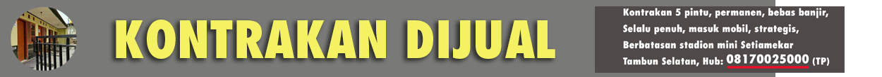 RUMAH KONTRAKAN DIJUAL: Rumah kontrakan permanen, LT 125 m2, luas bangunan 100 m2, mobil masuk, belum bersertifikat, strategis, air bagus, kondisi sangat bagus, selalu full, bebas banjir. Peminat bisa hubungi langsung pemilik. HP 08170025000 (TP).